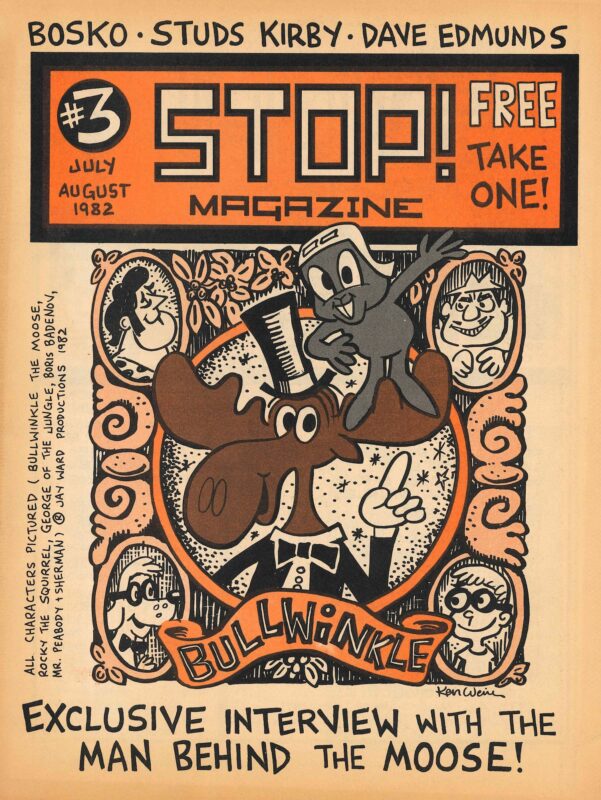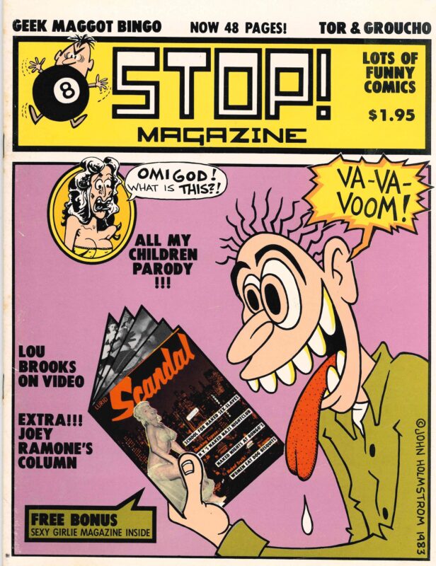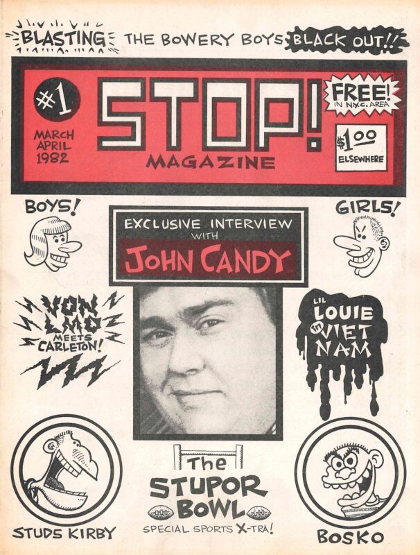 Stop was a punk and underground pop culture and humor magazine out of New York City, published in the early 1980s. Co-edited by former Punk publisher John Holmstrom and J.D. King, the magazine covered underground music, pop culture, and slapstick humor, with features such as satirical articles, interviews with icons such as John Candy, Joey Ramone, and Soupy Sales, and comics by several of the era’s defining underground comics artists. The magazine as a whole demonstrated New York punk’s affinity for slapstick comedy and shock humor. It ran for 9 issues over 3 years. (53393) $2,500